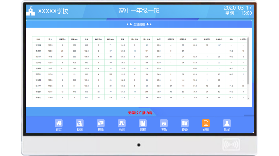 成績部分顯示全班同學(xué)各科成績及總成績,在班級、年級的排名情況等信息。